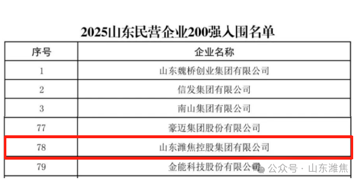 近日,山東省工商聯(lián)、省發(fā)展改革委、省科技廳、省人力資源社會(huì)保障廳、省農(nóng)業(yè)農(nóng)村廳、省商務(wù)廳、省稅務(wù)局、省市場(chǎng)監(jiān)管局、省總商會(huì)共同組織開展了2025山東民營企業(yè)百強(qiáng)系列榜單發(fā)布活動(dòng)。山東濰焦控股集團(tuán)有限公司榮登“2025山東民營企業(yè)200強(qiáng)”第78位。